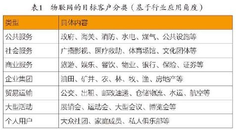 物联网不仅要实现人物间的信息智能化,还要实现物物间的信息智能化。因此,从服务对象来看,其目标客户可分为人和物两种类型,前者包括公众、政企和家庭3个市场,后者主要指动物、器物等。物联网应用具有时空跨度大、数据交互性强等特征,从这个角度看,物联网的目标客户分类如表1所示。